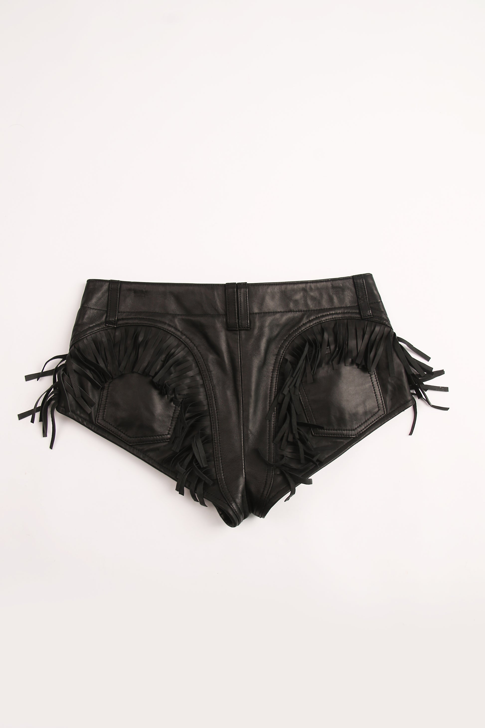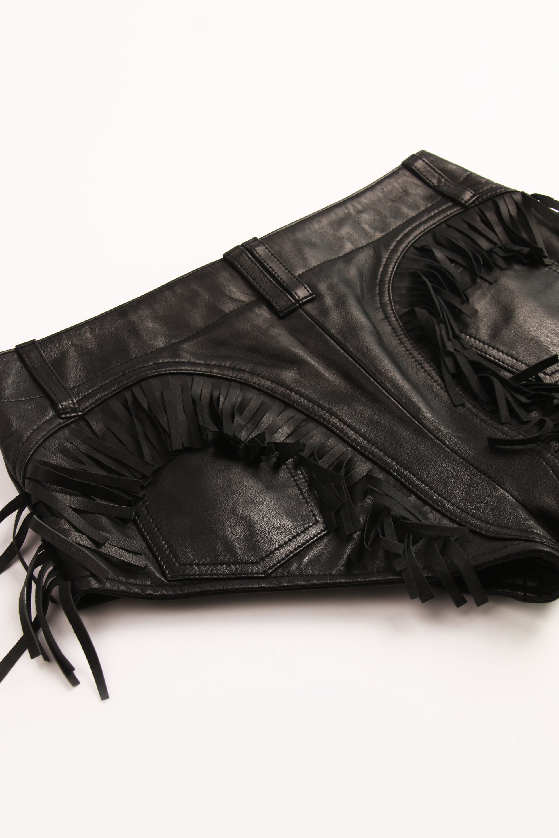 Turn up the heat with the Tainted Fringed Shorts. Crafted from genuine leather, these shorts are all about attitude and edge. The dramatic fringe detailing dances with every step you take, creating movement and a sense of wild freedom. The fit is tailored to hug your curves, while the edgy fringing adds an unexpected touch of fierce femininity.
