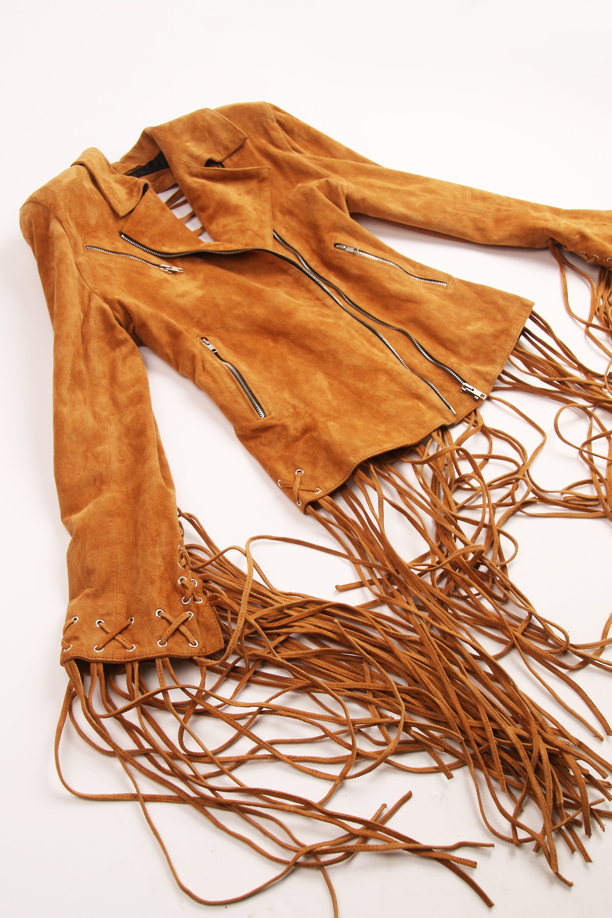 But what truly sets this jacket apart? The floor-length tassels that cascade down the back, swaying with every move you make and adding an electrifying edge to your every step. It’s the perfect combination of rebellious rock ‘n’ roll and high-fashion luxe.