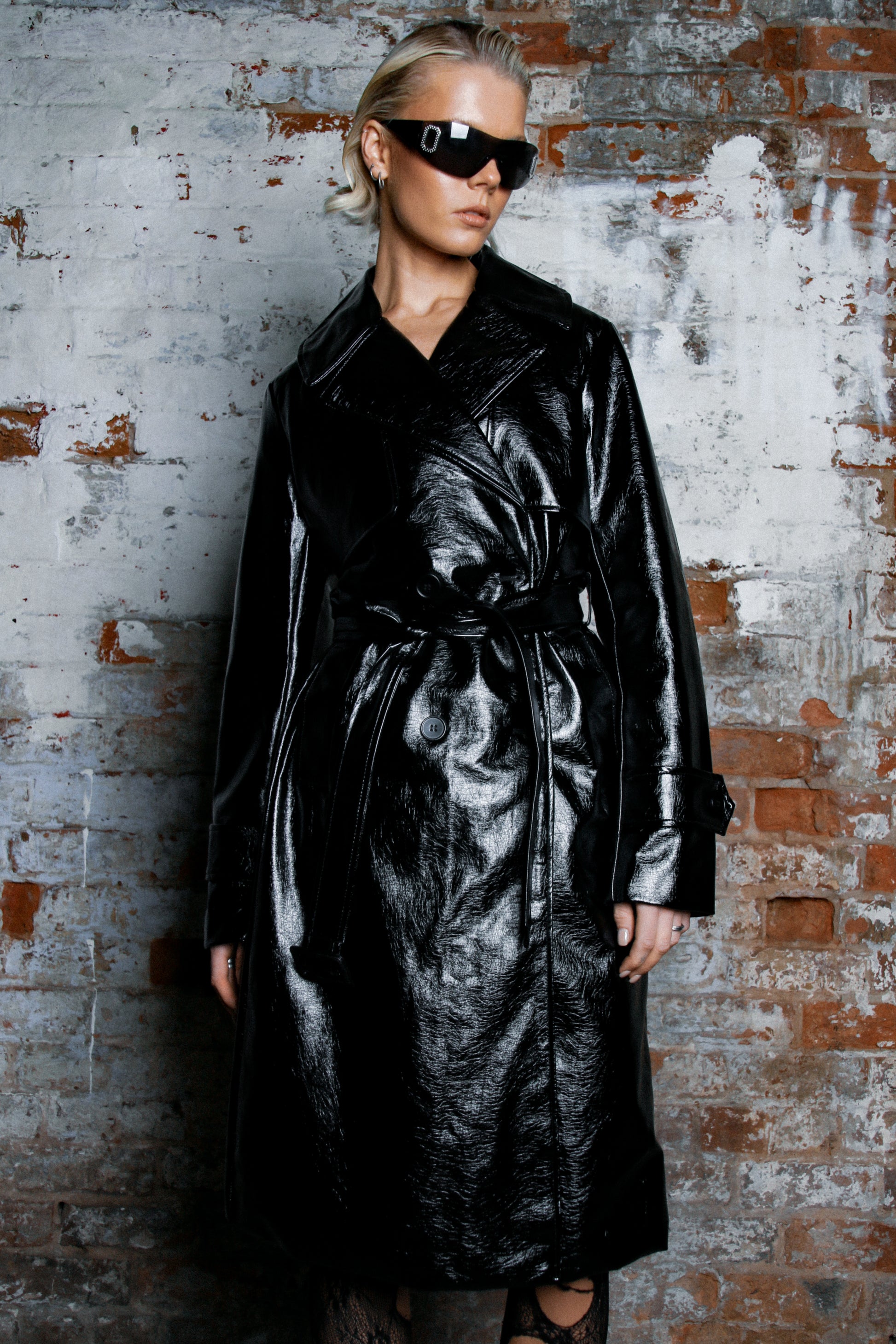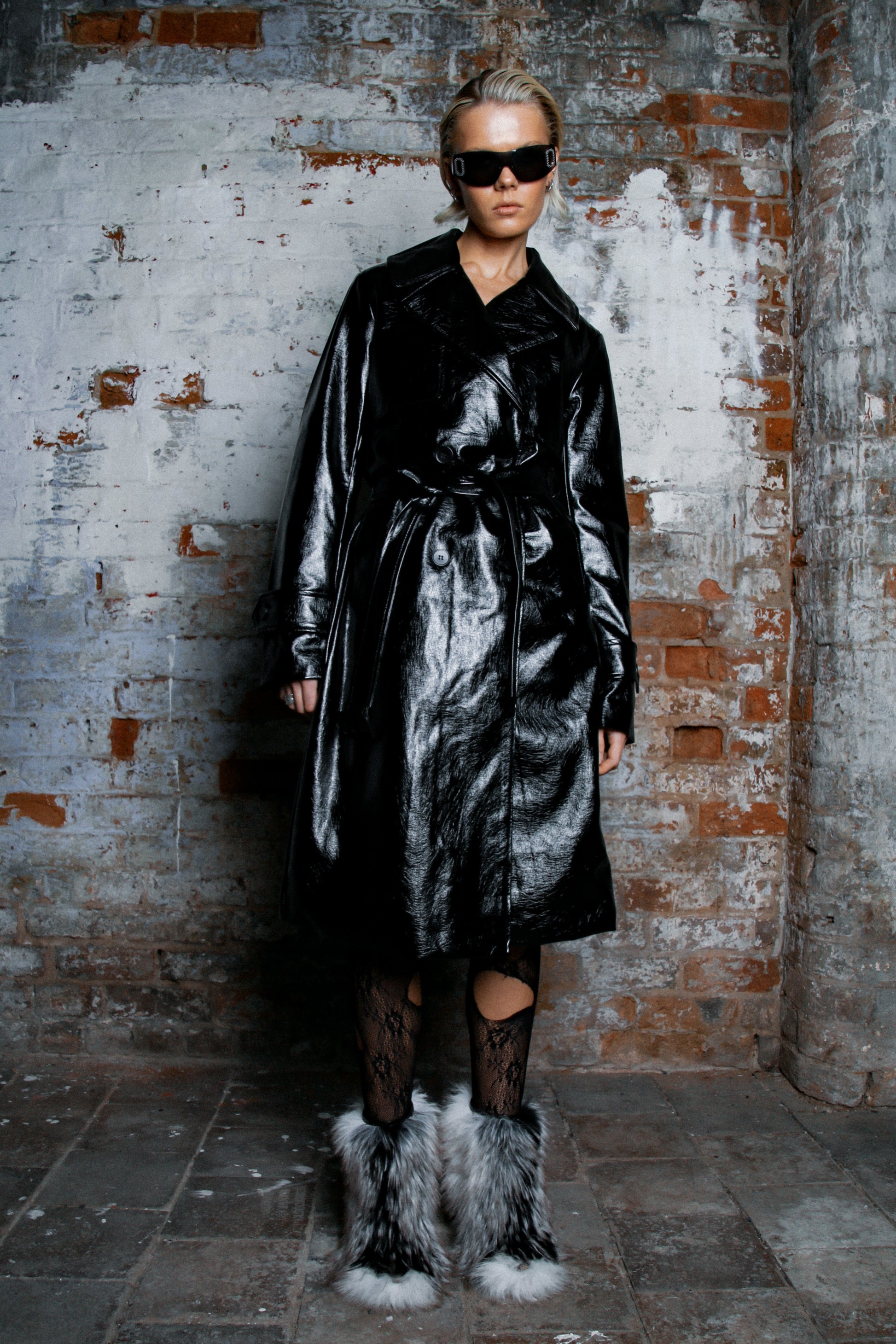 Made from a premium blend of 55% polyurethane and 45% viscose, the coat combines the structure and gloss of vegan leather with the fluidity and softness of viscose. The result - a trench that feels as powerful as it looks.