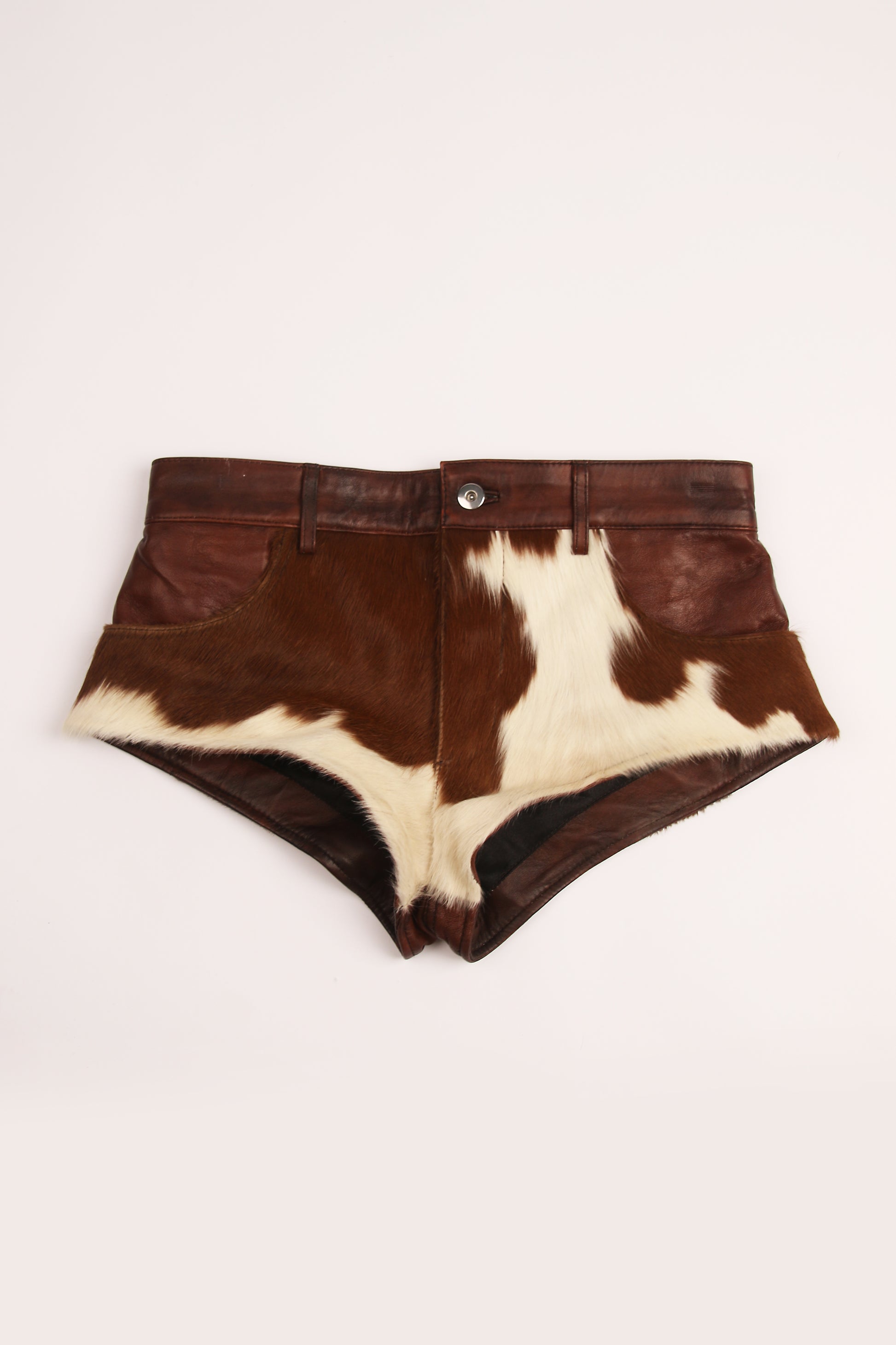 Yeehaw, but make it fashion. Our MOO B**CH print leather shorts are for the girl who’s not afraid to stand out and own the spotlight. Crafted from real, buttery-soft leather, they hug your curves and showcase your legs with unapologetic attitude. The bold cow print adds a touch of Western wild, while the sleek finish brings them straight into the realm of high fashion. Whether you're tearing up the city streets or looking for that outlaw chic look, these shorts will have you turning heads and breaking hearts.