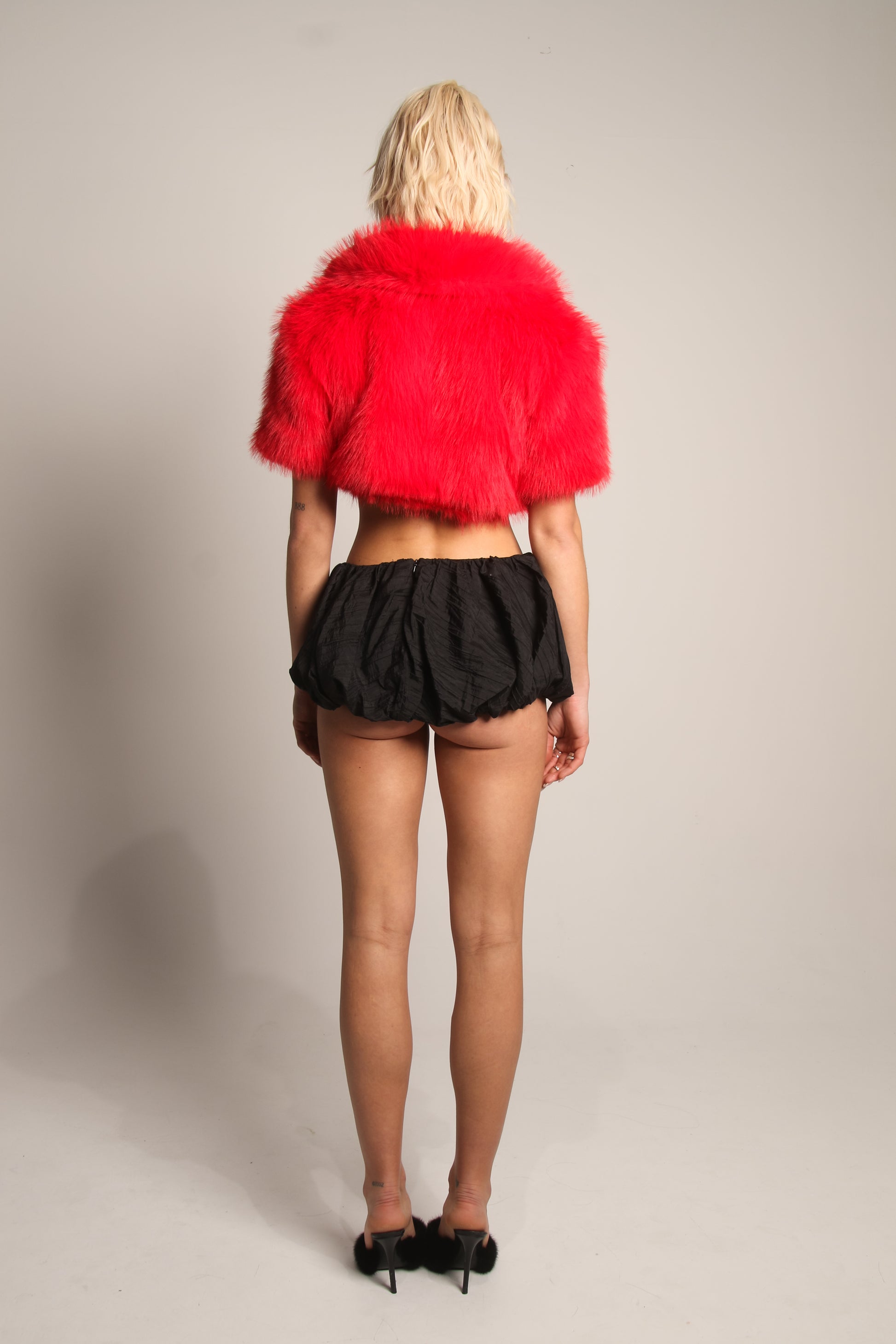 Flirtatious, fierce, and impossible to ignore, the Bloody Valentine Red Bolero is designed to ignite attention. Crafted from plush polyester faux fur in a striking crimson hue, this cropped silhouette wraps the shoulders in bold texture while delivering unapologetic glamour. Three genuine leather straps fasten the piece with a provocative edge, blending softness with strength. The contrast of lush faux fur and real leather creates a statement layer that feels both decadent and daring—perfect for nights that call for drama, confidence, and a little danger.